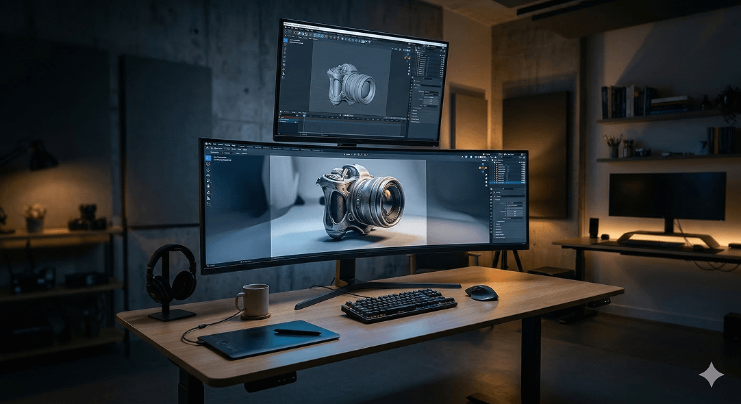 Camera positioning in a 3D scene works exactly like a real camera — focal length, aperture, and position all affect how the product is presented. The hero angles that show the product most favorably need to be identified and set up deliberately, not discovered accidentally.