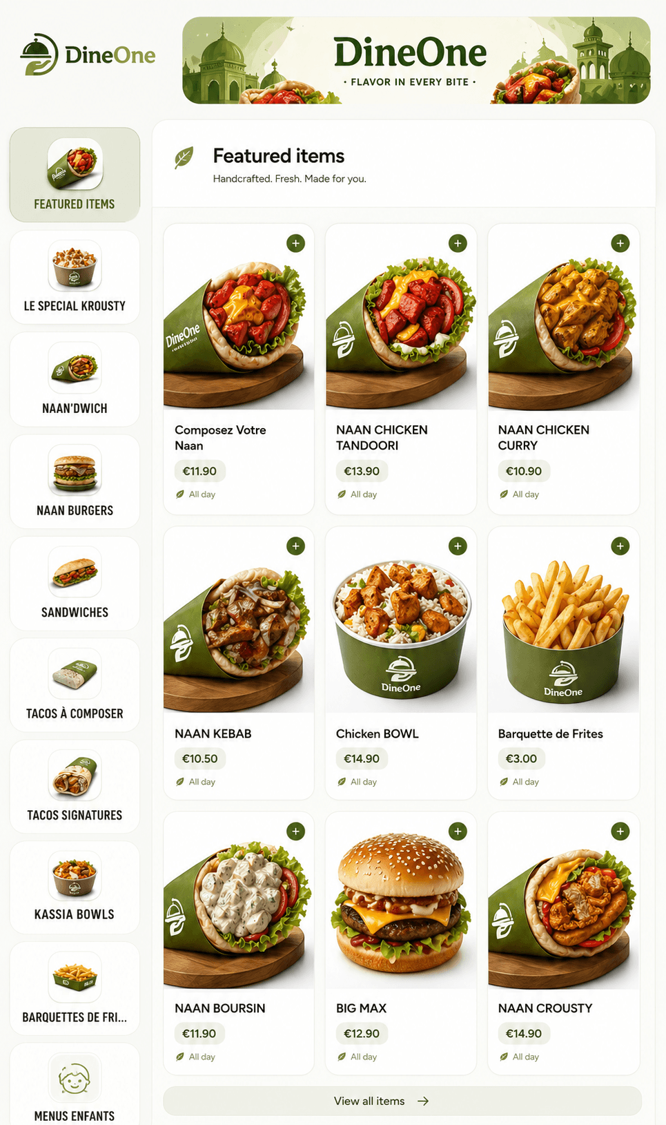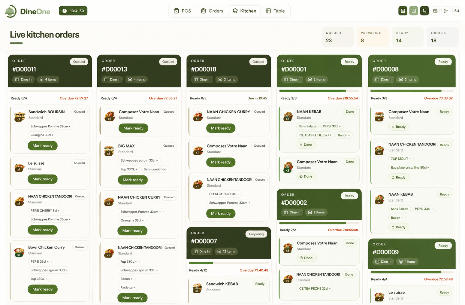 DineOne brings restaurant POS, kiosk ordering, kitchen operations, inventory, and branch reporting into one connected platform. It is designed for restaurants that want faster order flow, fewer manual mistakes, clearer kitchen visibility, and a system that can grow from one outlet to a multi-branch operation.