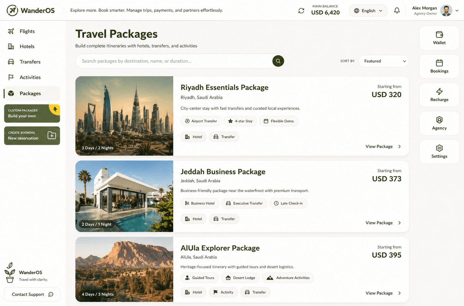 WanderOS helps travel businesses manage flights, hotels, transfers, activities, and packages from a single booking platform. It is built for UAE travel agencies and destination management companies that need supplier integrations, agent workflows, markup control, and customer-ready booking experiences.