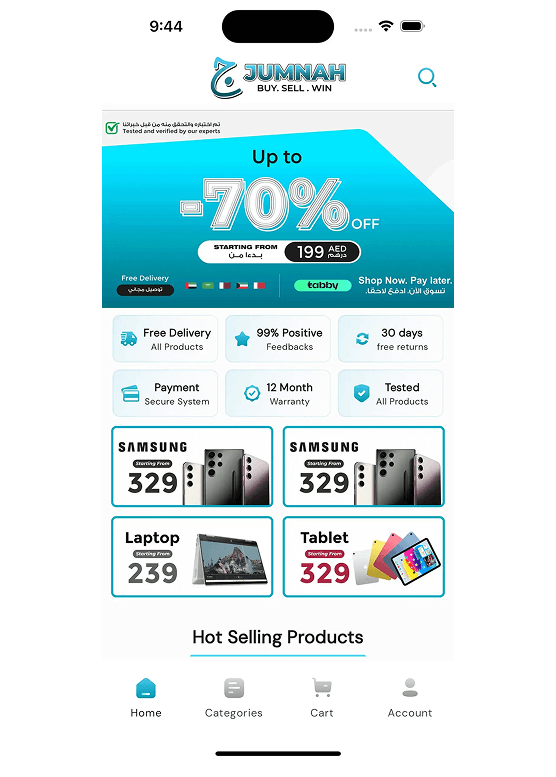 Jumnah is a technology-focused e-commerce platform built for customers across the UAE, Saudi Arabia, Qatar, Kuwait, and Bahrain. The platform enables users to discover, compare, and purchase smartphones, tablets, laptops, and accessories through a modern online marketplace experience.